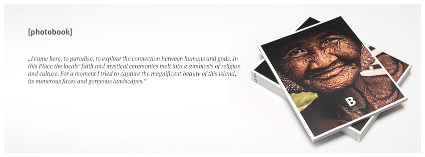 With an open heart and sensitive eyes the freelance photographer portrayed his hosts, their culture and the breathtaking landscapes they live in. Seen with his eyes, the so called island of gods unfolds a unique atmosphere, which varies between the profanity in times of the „global village“ and fascinating timeless spirituality. The resulting book of photographs captivates the viewer, while taking him along and allowing him to take part.